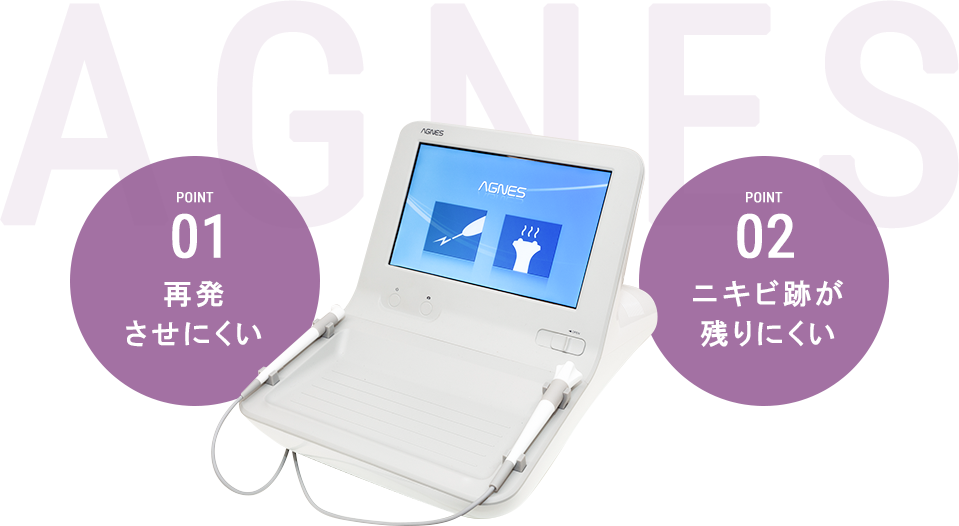 アグネスは、「何度も同じところにニキビが出来る」「いろいろ試したがどれも効果がなかった」と、これまでのニキビ治療に満足できなかった方に大変おすすめのニキビ治療です。