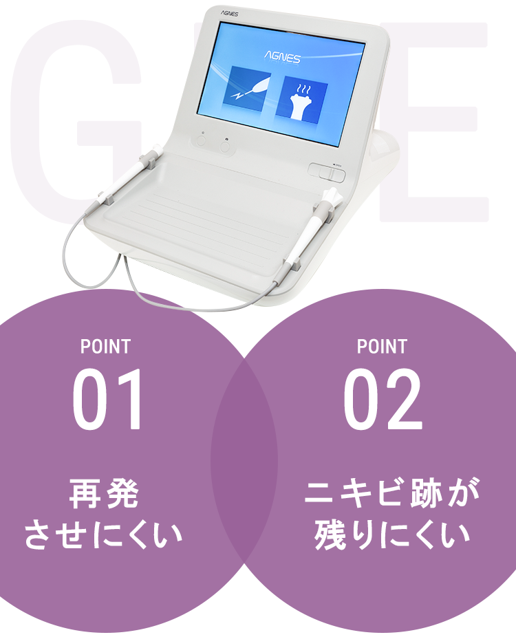 - 既存のニキビ治療法(飲み薬、スケーリング、剥離、レーザーなど)は、状態を一時的に好転させる程度でしたが、アグネスの選択的皮脂腺破壊術は、ニキビ菌の根源である皮脂腺を根本的に取り除くため、施術部位はほとんど再発しません。