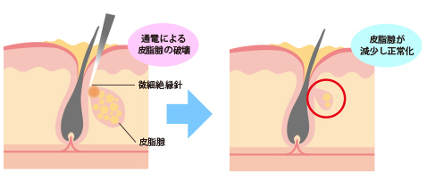 ニキビが発生している毛穴へ微細絶縁針を挿入して皮脂腺を消滅させます。皮脂腺を消滅させた毛穴からはニキビができないため、再発しにくくなります。
