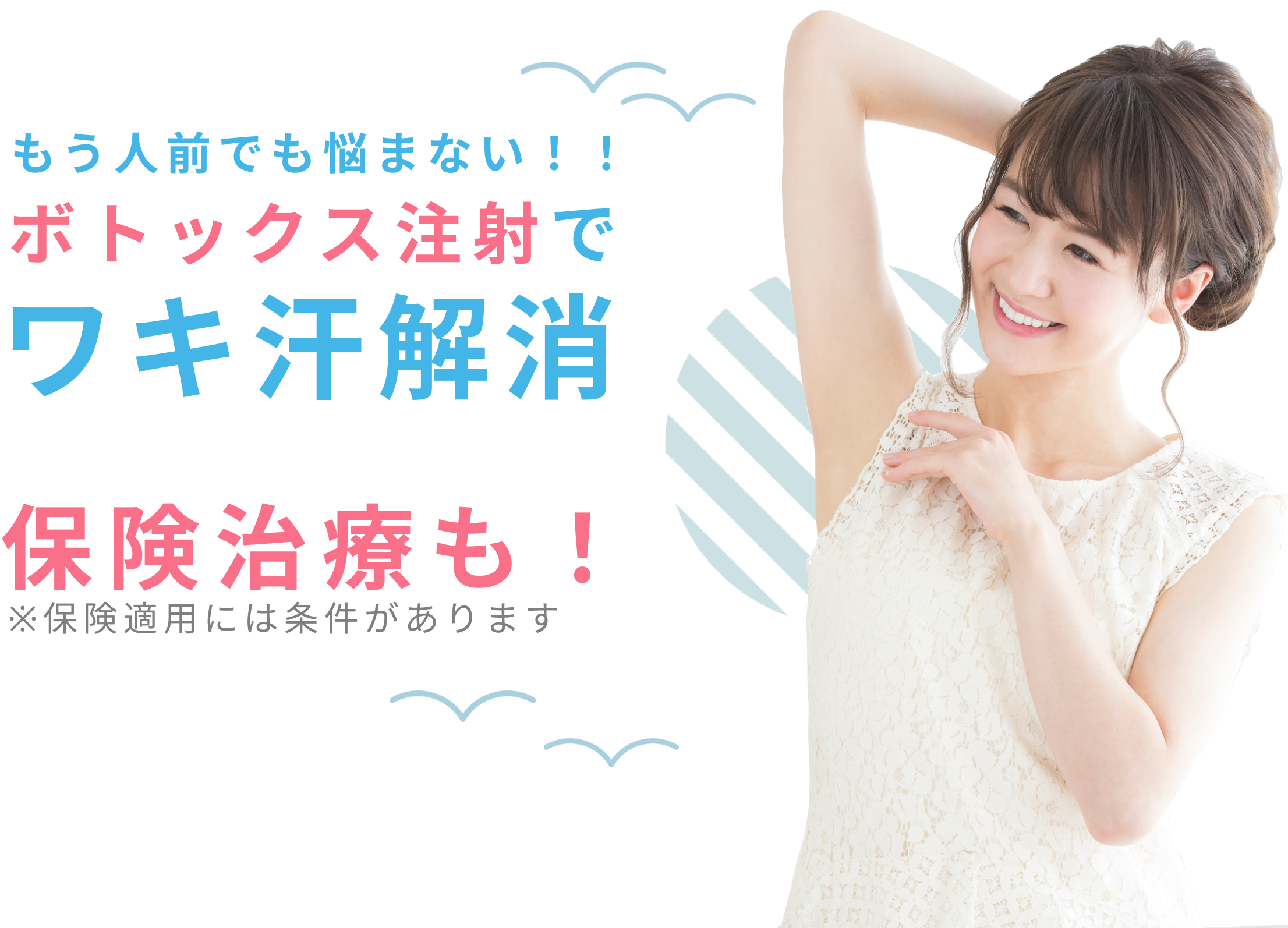 大切な仕事の場面で汗が気になる、一日に何度も制汗剤を塗り直している、汗じみが気になって服が自由に選べない、といったお悩みを抱えている方は日本皮膚科学会認定皮膚科専門医によるボトックス注射を是非ご利用下さい。